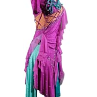 Bonel Latin Dance Costume – This stunning costume features a pleated center and ruffled edges that create a flattering silhouette for larger ladies. The teal and lavender colors are a unique and beautiful combination that will make you stand out on the dance floor. The costume is made of stretchy fabric that fits sizes 10-12 comfortably.