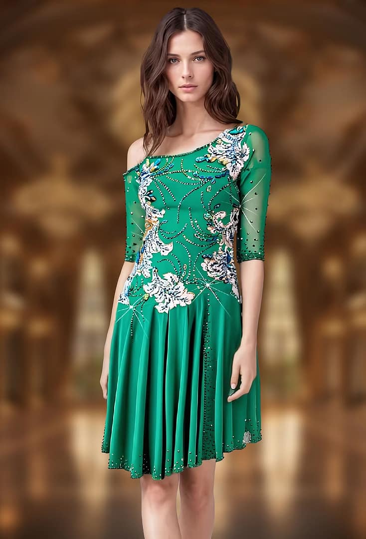 Introducing Carmen, an enchanting ballroom dress crafted for sizes 8-10. Designed with a figure-flattering silhouette, Carmen features a pleated skirt elegantly cut on the diagonal for a slimming effect. The dress is adorned with intricate embroidered appliques, along with large stones and crystals in a variety of colors, adding a touch of opulence and vibrancy to your dance.