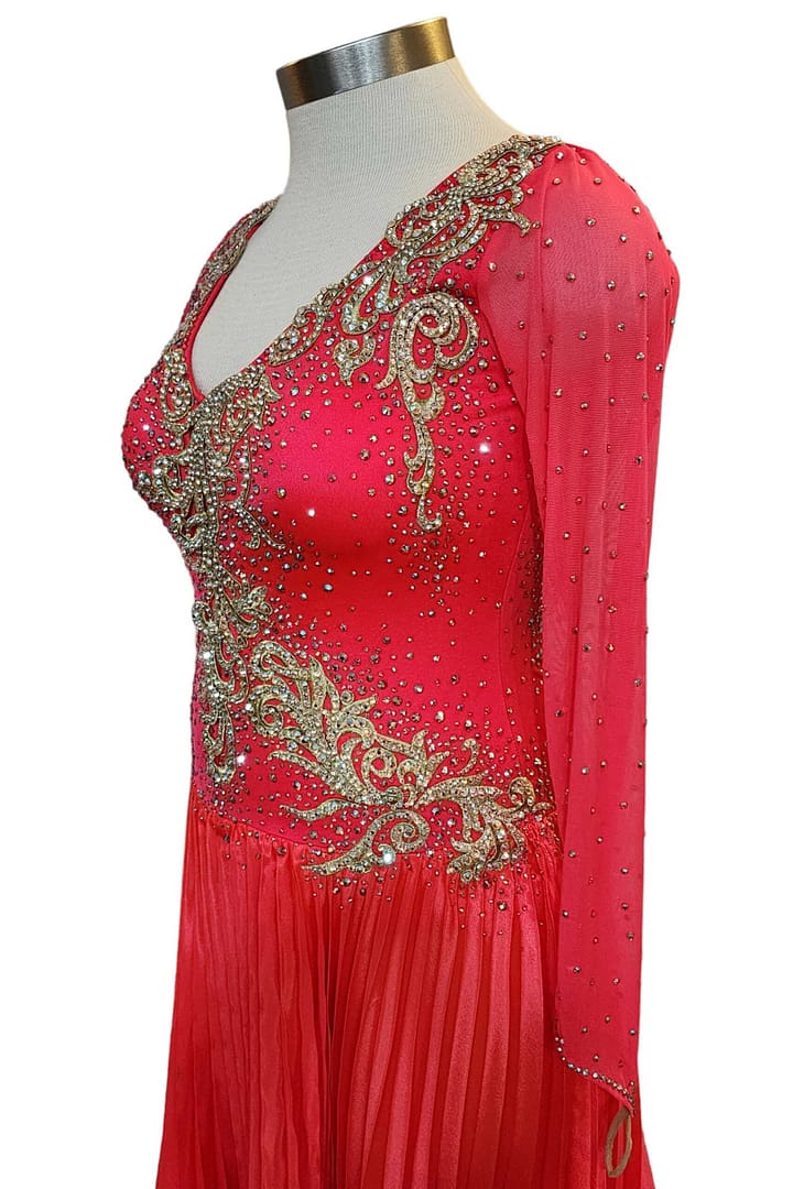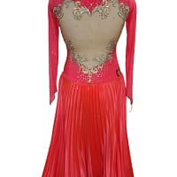 Introducing our captivating ballroom dress crafted with the finest Chrisanne Clover fabric in the vibrant hue of Flaming Red. This stunning creation is adorned with dazzling high-quality European crystals, adding a touch of glamour that catches every spotlight. Embrace the latest trends with a pleated skirt, perfectly marrying fashion and grace.