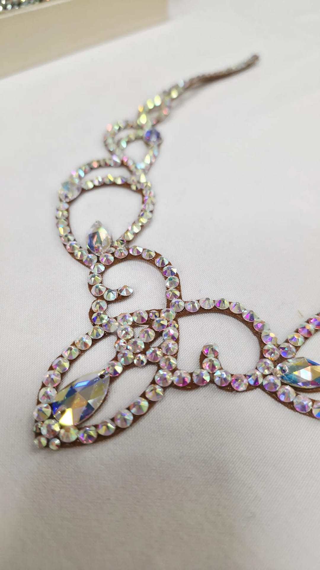 Each crystal is carefully placed to enhance neckline framing while maintaining flexibility and comfort. The elegant scroll design adds visual movement and sophistication, making it an ideal complement to both Standard and Smooth ballroom gowns.
