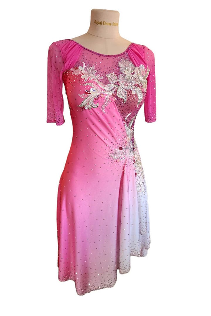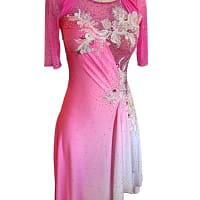 Gia is a vibrant Latin dress crafted to captivate the moment you step onto the dance floor. Its striking ombre design flows from a deep pink on the upper right to a soft, luminous white on the lower left, creating a graceful diagonal gradient that enhances movement. The skirt follows the same dynamic diagonal cut, adorned with delicate white lace that adds texture and visual charm.
