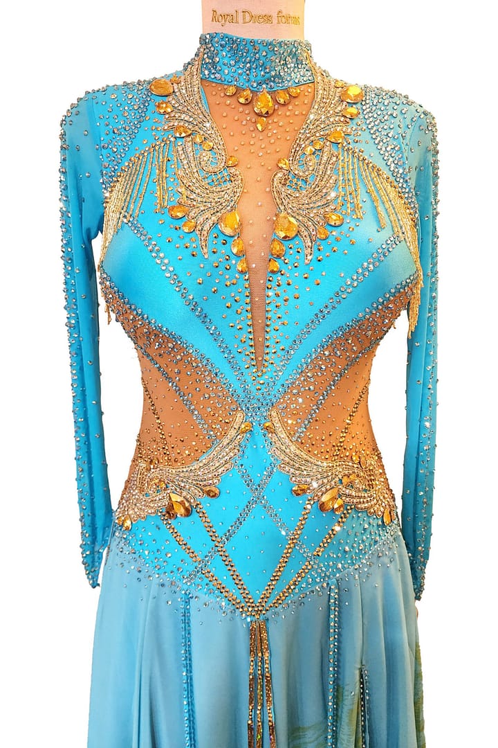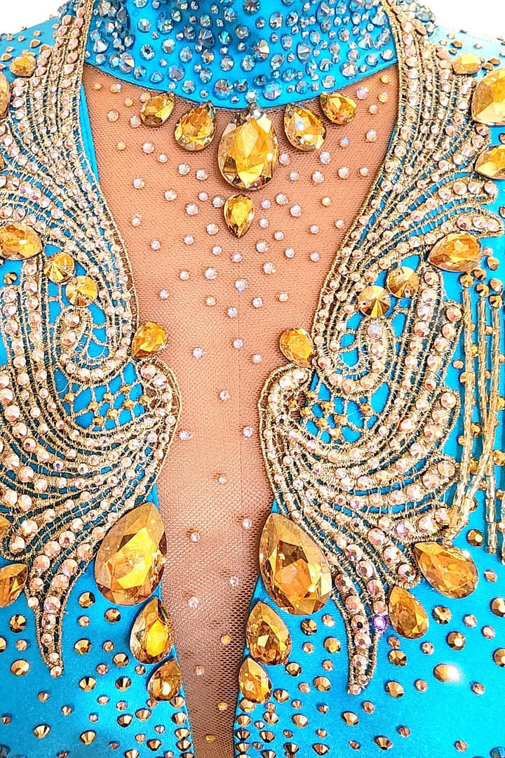 Make a dazzling entrance with the Hadley Ballroom Dress, a one-of-a-kind size 6 – 8 costume designed to captivate and charm. This exquisite piece features a layer of radiant gold appliqués on a blue fishnet, creating a luxurious contrast against the nude-colored lycra beneath. Each netting connection is meticulously hand-sewn and adorned with topaz crystals, ensuring that every movement sparkles.