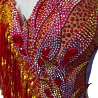 Hand-placed crystal work flows in sculpted lines across the bodice, creating a striking illusion of flame rising through the silhouette. Layers of shimmering fringe and sequined movement sweep asymmetrically across the body, amplifying every hip action, spin, and sharp Latin accent. The result is a gown that comes alive under ballroom lighting — flashing gold, red, and fire with every step.