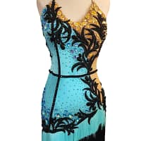 Make a dazzling entrance with the Jayla Latin Dress, a one-of-a-kind size 4 – 6 costume designed to captivate and charm. This exquisite piece features a layer of radiant gold appliqués on a blue fishnet, creating a luxurious contrast against the nude-colored lycra beneath. Each netting connection is meticulously hand-sewn and adorned with topaz crystals, ensuring that every movement sparkles.