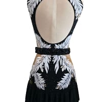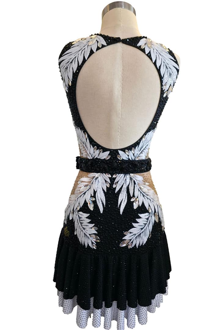 Striking, refined, and full of contrast, Onyx Whisper is a Performance Series Latin dress designed to deliver elegance with a powerful stage presence. The deep black base is illuminated by bold white feather-inspired appliqué and shimmering crystal embellishments, creating a dramatic visual effect that moves beautifully under competition lighting.