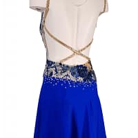Adorned with a sparkling array of blue and clear crystals in various sizes, Manon glistens with every movement, reflecting the spotlight and drawing all eyes to you. The intricate embroidered floral appliqué weaves its way around the costume, adding a touch of nature’s beauty to the sophisticated design.